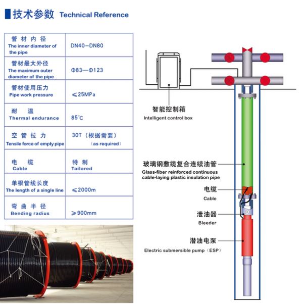 1、一體式電纜集成式玻璃鋼敷纜復合連續(xù)油管,集輸油,輸送電能及傳輸信號功能于一體,電纜和管都免維護,設計壽命20年以上。